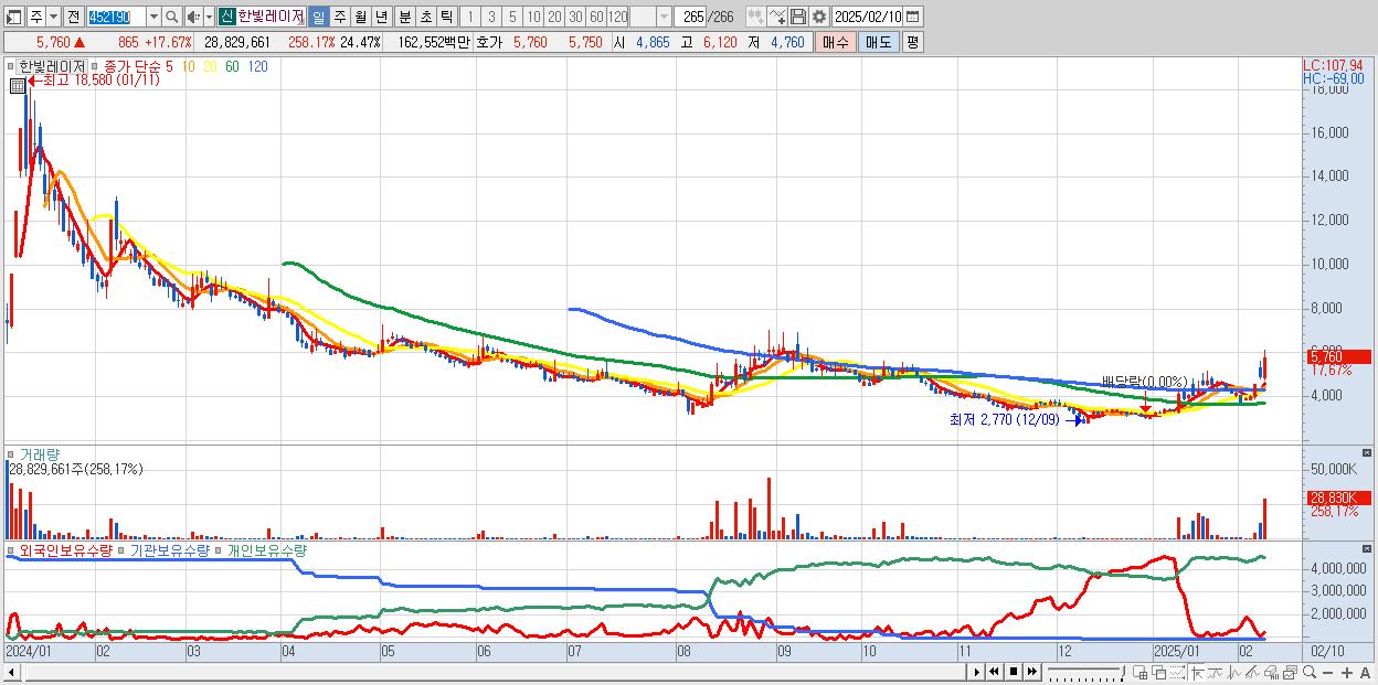 - 한빛레이저 (5,760원 ▲ 17.67% , 시총: 1,334억, 거래량: 28,829,661, 거래대금:1,626억)
