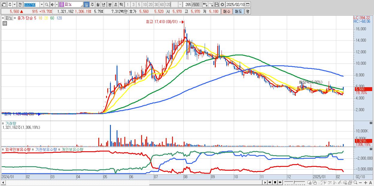 - 피노 (5,560원 ▲ 19.7% , 시총: 1,269억, 거래량: 1,321,162, 거래대금:73억)