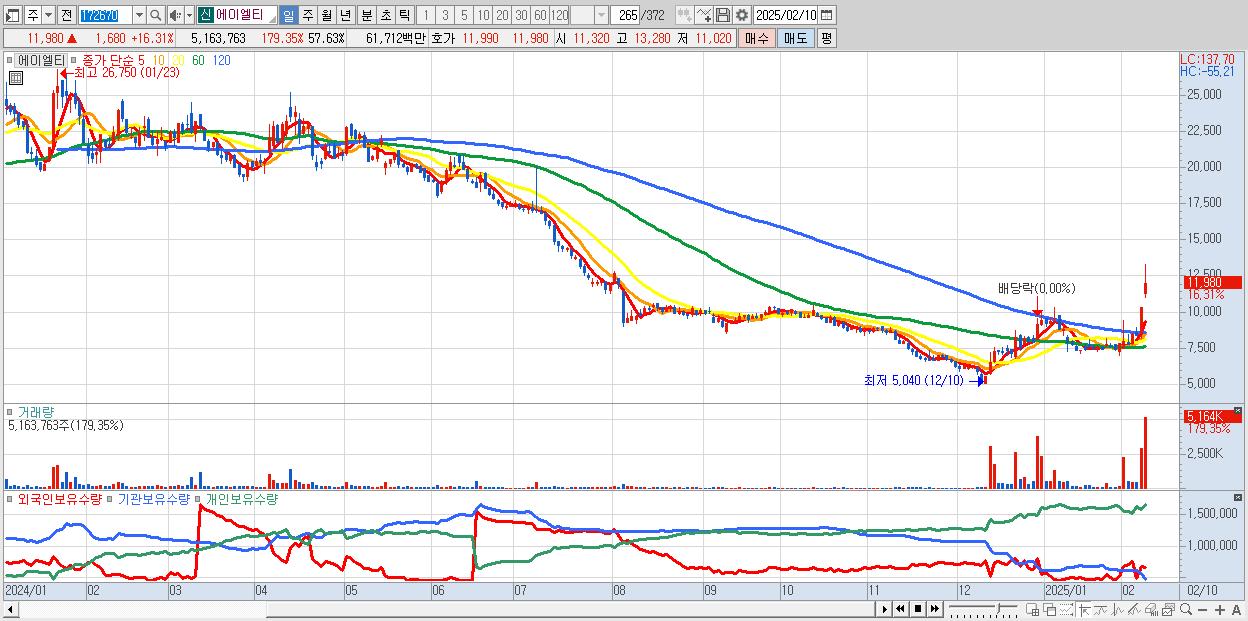 - 에이엘티 (11,980원 ▲ 16.31% , 시총: 1,073억, 거래량: 5,163,763, 거래대금:617억)