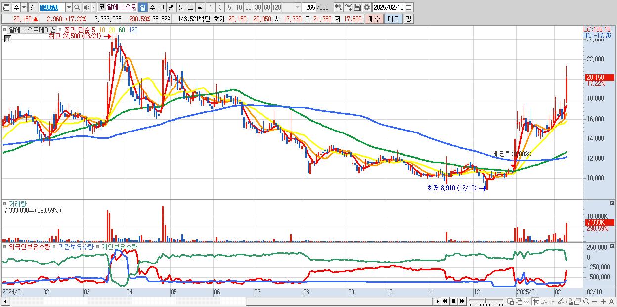 - 알에스오토메이션 (20,150원 ▲ 17.22% , 시총: 1,875억, 거래량: 7,333,038, 거래대금:1,435억)