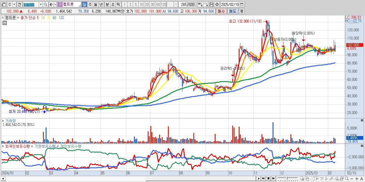 - 펩트론 (102,000원 ▲ 6.69% , 시총: 23,763억, 외국인 순매수 거래금:296억)