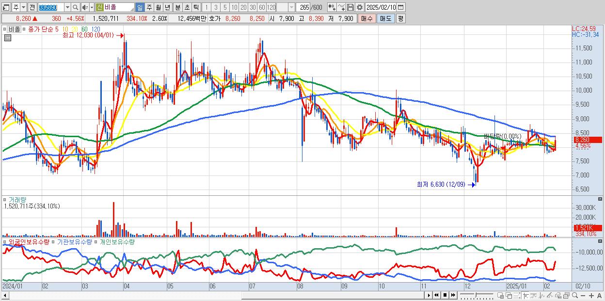 - 비올 (8,260원 ▲ 4.56% , 시총: 4,825억, 외국인 순매수 거래금:37억)