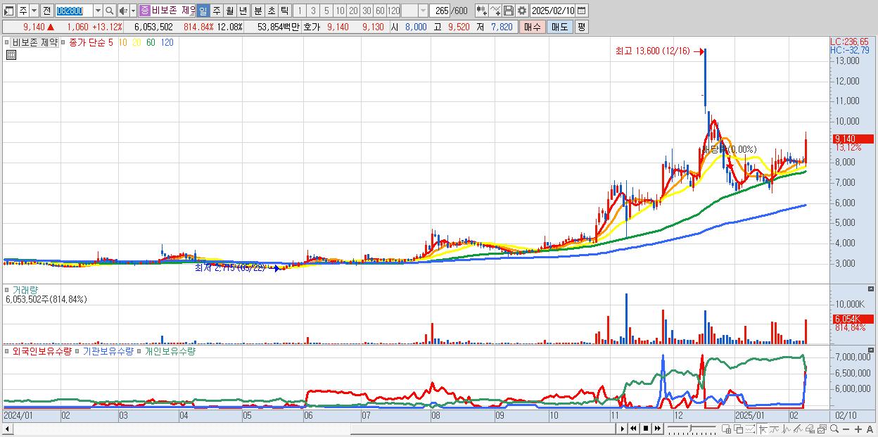 - 비보존 제약 (9,140원 ▲ 13.12% , 시총: 4,580억, 외국인 순매수 거래금:47억)