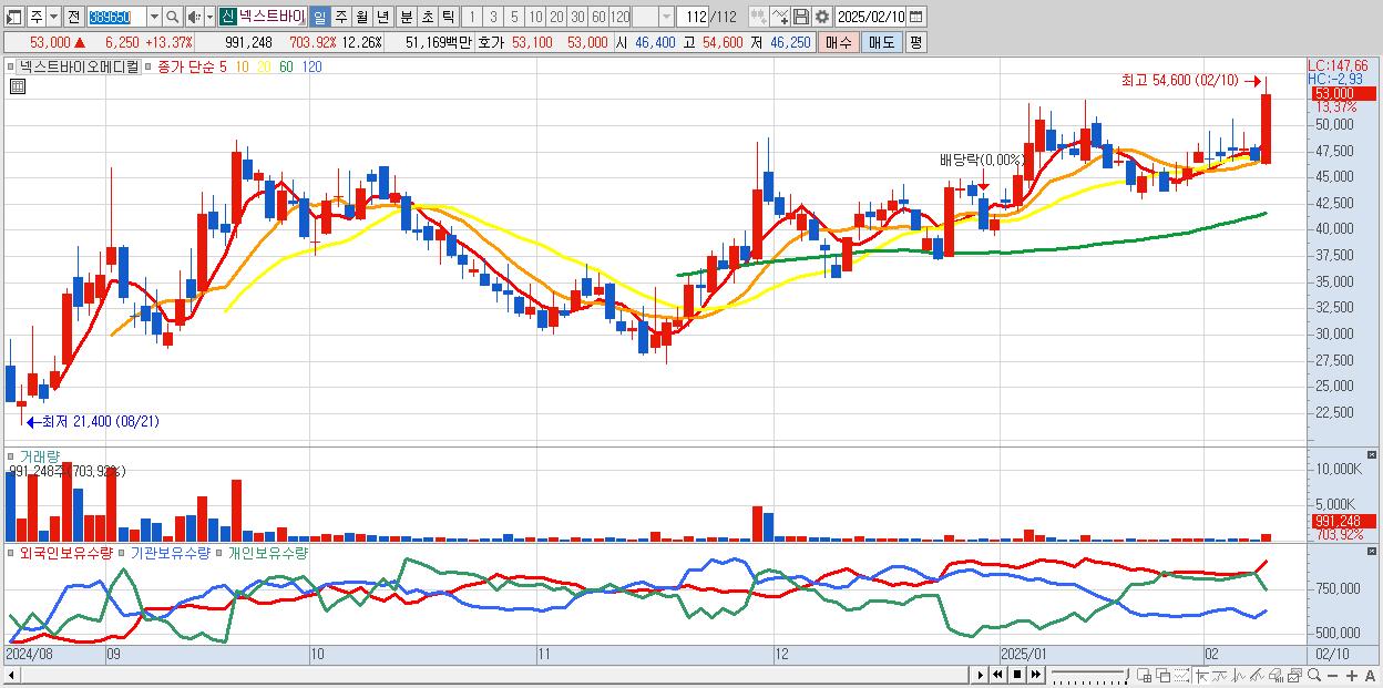 - 넥스트바이오메디컬 (53,000원 ▲ 13.37% , 시총: 4,286억, 외국인 순매수 거래금:59억)