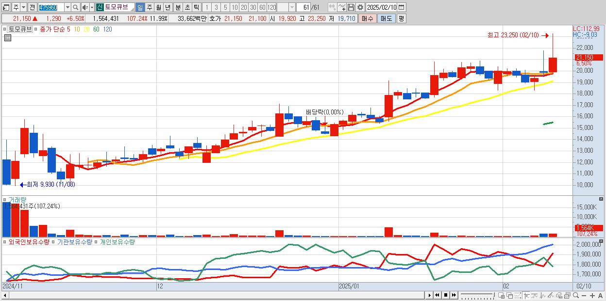 - 토모큐브 (21,150원 ▲ 6.5% , 시총: 2,760억, 외국인 순매수 거래금:42억)