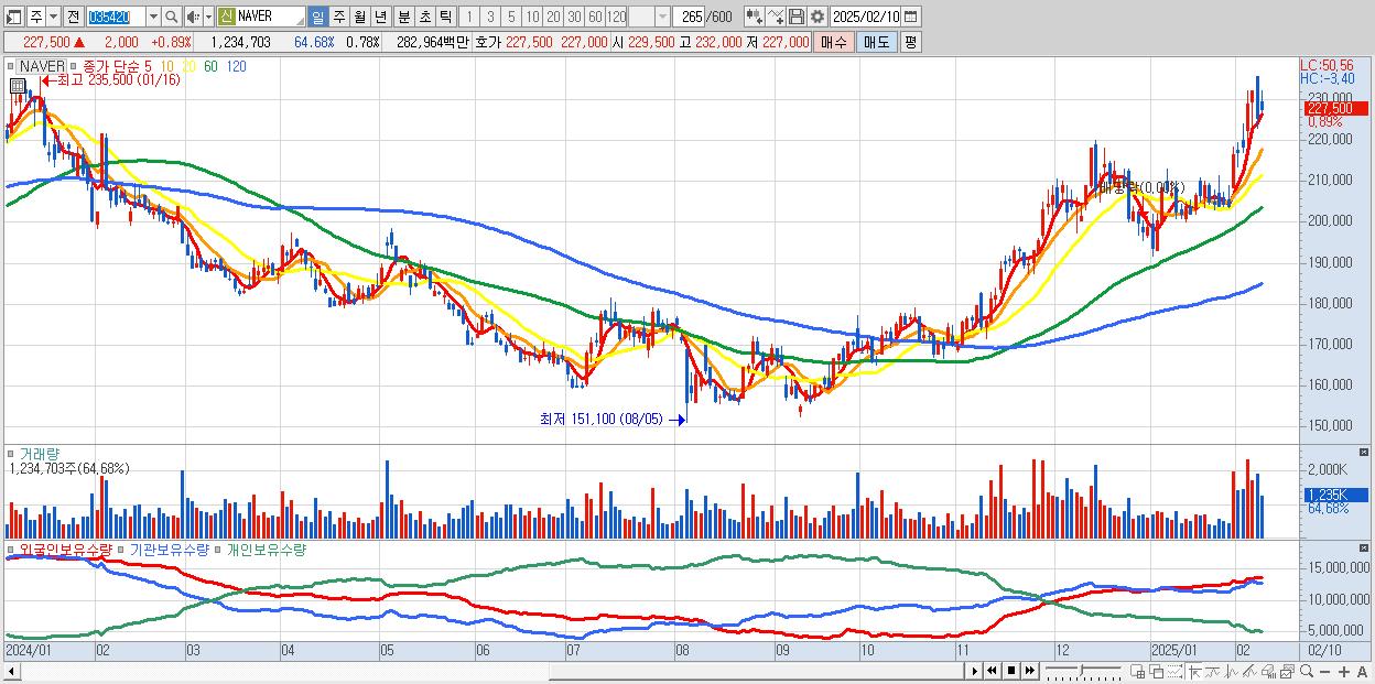 - NAVER (227,500원 ▲ 0.89% , 시총: 360,444억, 외국인 순매수 거래금:190억)