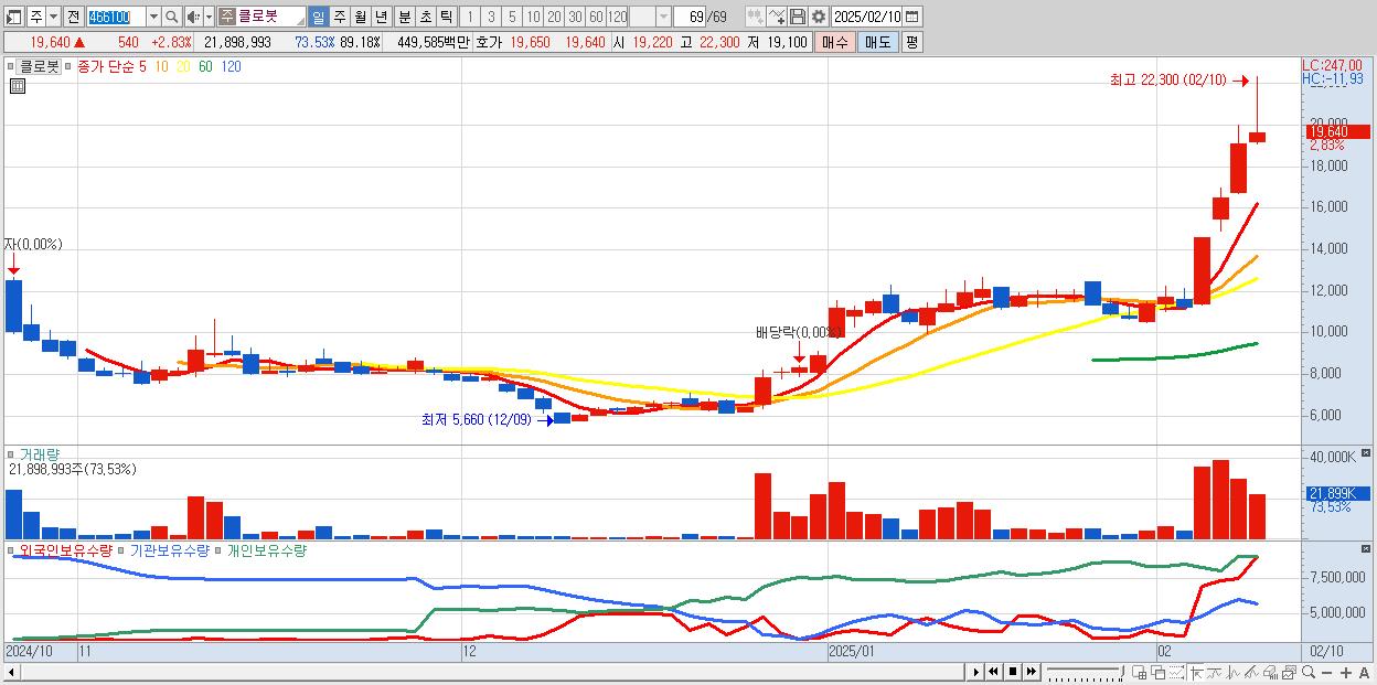 - 클로봇 (19,640원 ▲ 2.83% , 시총: 4,823억, 외국인 순매수 거래금:95억)