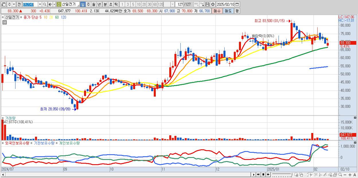 - 산일전기 (69,300원 ▲ 0.43% , 시총: 21,099억, 외국인 순매수 거래금:42억)