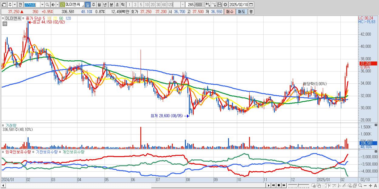 - DL이앤씨 (37,250원 ▲ 0.95% , 시총: 14,413억, 외국인 순매수 거래금:44억)