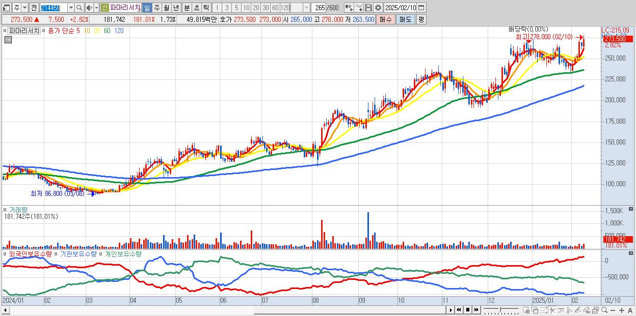 - 파마리서치 (273,500원 ▲ 2.82% , 시총: 28,744억, 외국인 순매수 거래금:64억)