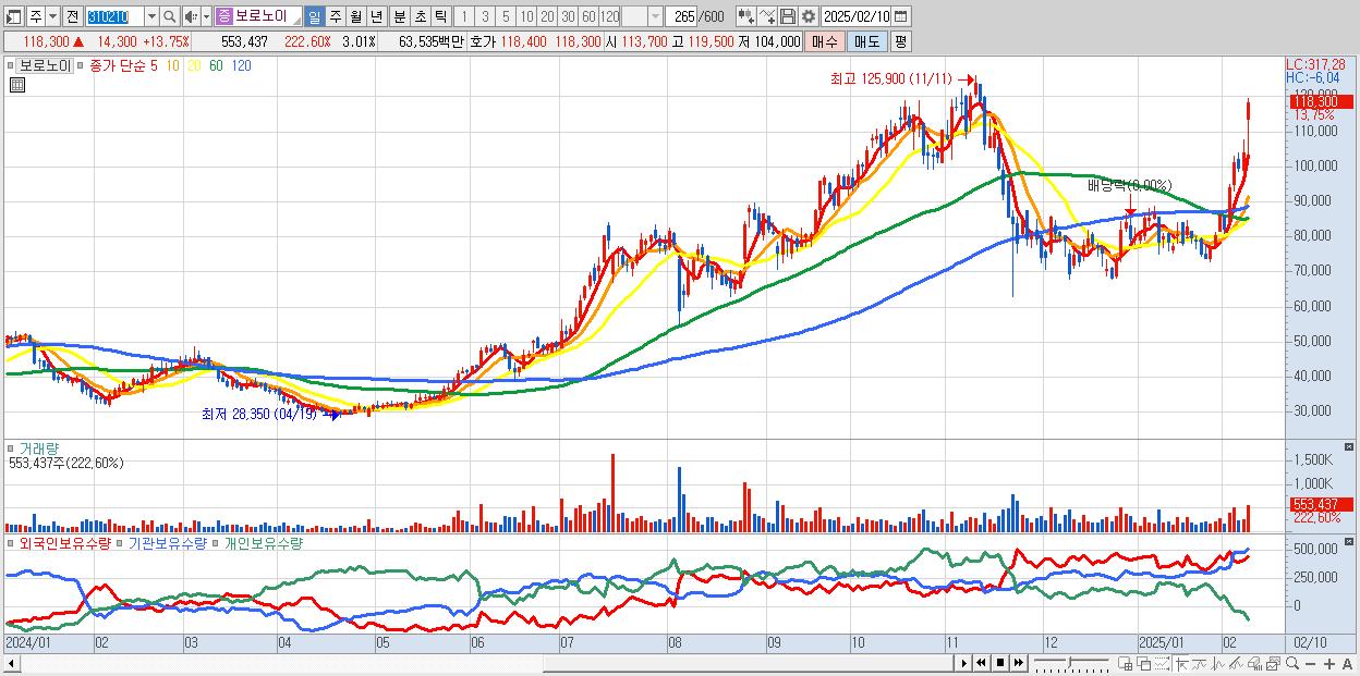 - 보로노이 (118,300원 ▲ 13.75% , 시총: 21,731억, 외국인 순매수 거래금:33억)