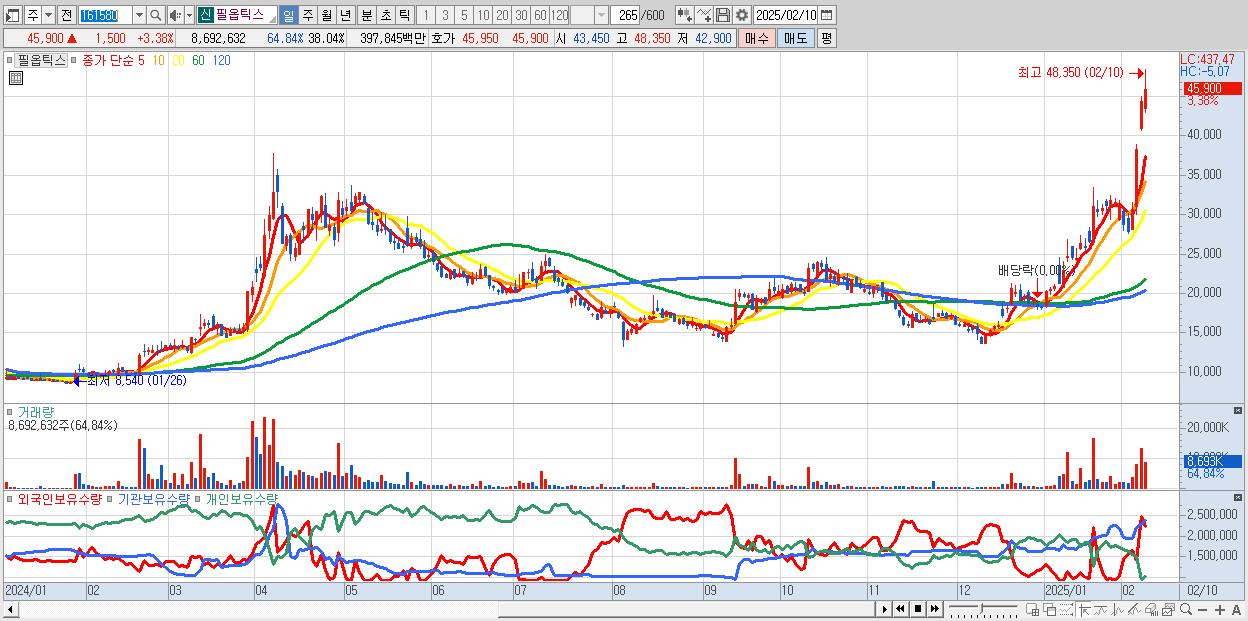 - 필옵틱스 (45,900원 ▲ 3.38% , 시총: 10,488억, 거래량: 8,692,632, 거래대금:3,978억, KOSDAQ)