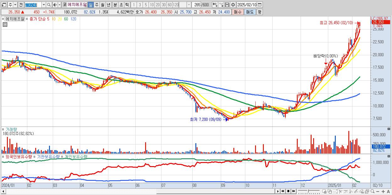 - 에치에프알 (26,350원 ▲ 1.74% , 시총: 3,507억, 거래량: 180,072, 거래대금:46억, KOSDAQ)