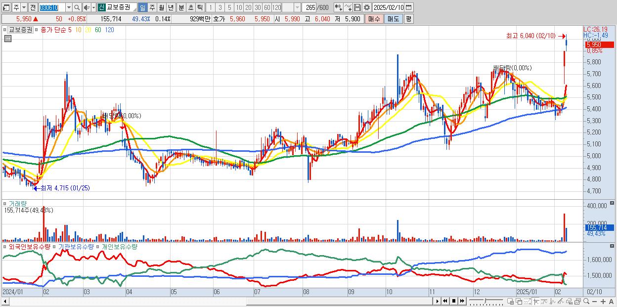 - 교보증권 (5,950원 ▲ 0.85% , 시총: 6,781억, 거래량: 155,714, 거래대금:9억, KOSPI)