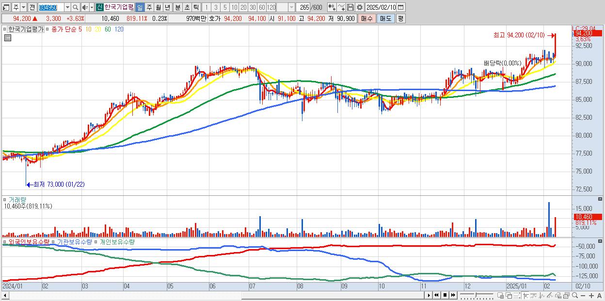 - 한국기업평가 (94,200원 ▲ 3.63% , 시총: 4,277억, 거래량: 10,460, 거래대금:10억, KOSDAQ)