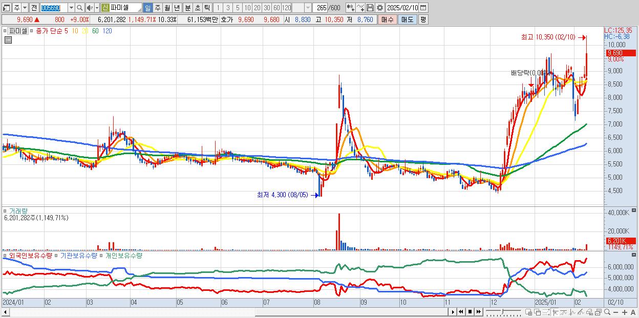 - 파미셀 (9,690원 ▲ 9% , 시총: 5,816억, 거래량: 6,201,282, 거래대금:612억, KOSPI)