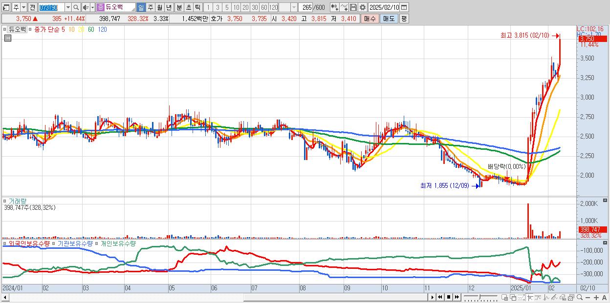 - 듀오백 (3,750원 ▲ 11.44% , 시총: 449억, 거래량: 398,747, 거래대금:15억, KOSDAQ)