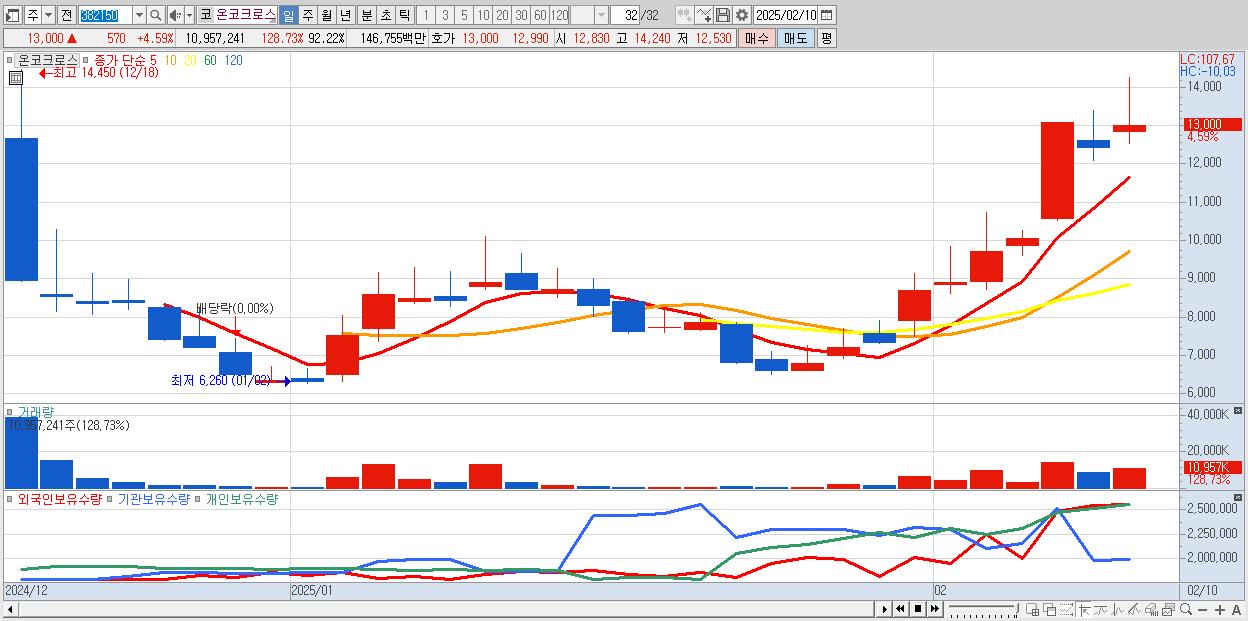 - 온코크로스 (13,000원 ▲ 4.59% , 시총: 1,545억, 거래량: 10,957,241, 거래대금:1,468억)
