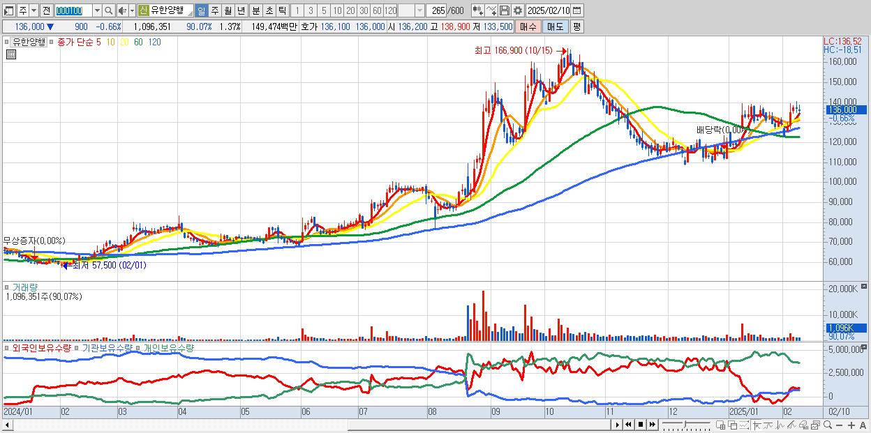 - 유한양행 (136,000원 ▼ -0.66% , 시총: 109,084억, 거래량: 1,096,351, 거래대금:1,495억)