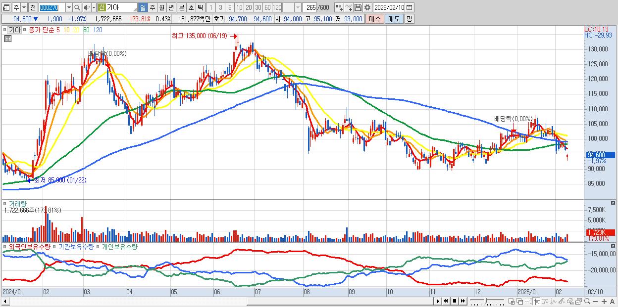 - 기아 (94,600원 ▼ -1.97% , 시총: 376,198억, 거래량: 1,722,666, 거래대금:1,619억)