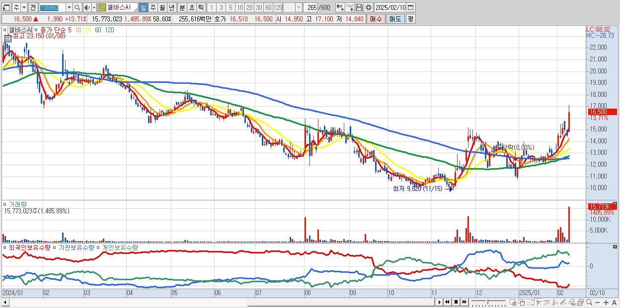 - 셀바스AI (16,500원 ▲ 13.71% , 시총: 4,441억, 거래량: 15,773,023, 거래대금:2,556억)