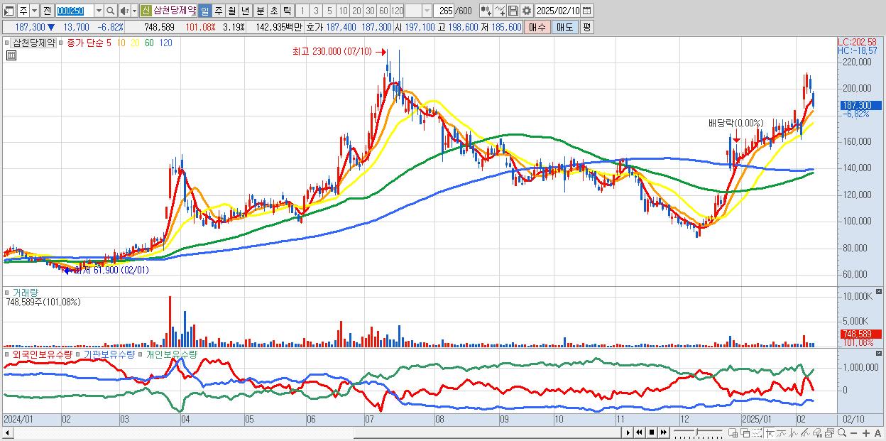 - 삼천당제약 (187,300원 ▼ -6.82% , 시총: 43,936억, 거래량: 748,589, 거래대금:1,429억)