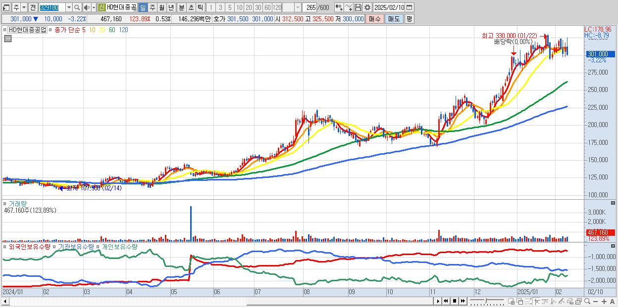 - HD현대중공업 (301,000원 ▼ -3.22% , 시총: 267,207억, 거래량: 467,160, 거래대금:1,463억)
