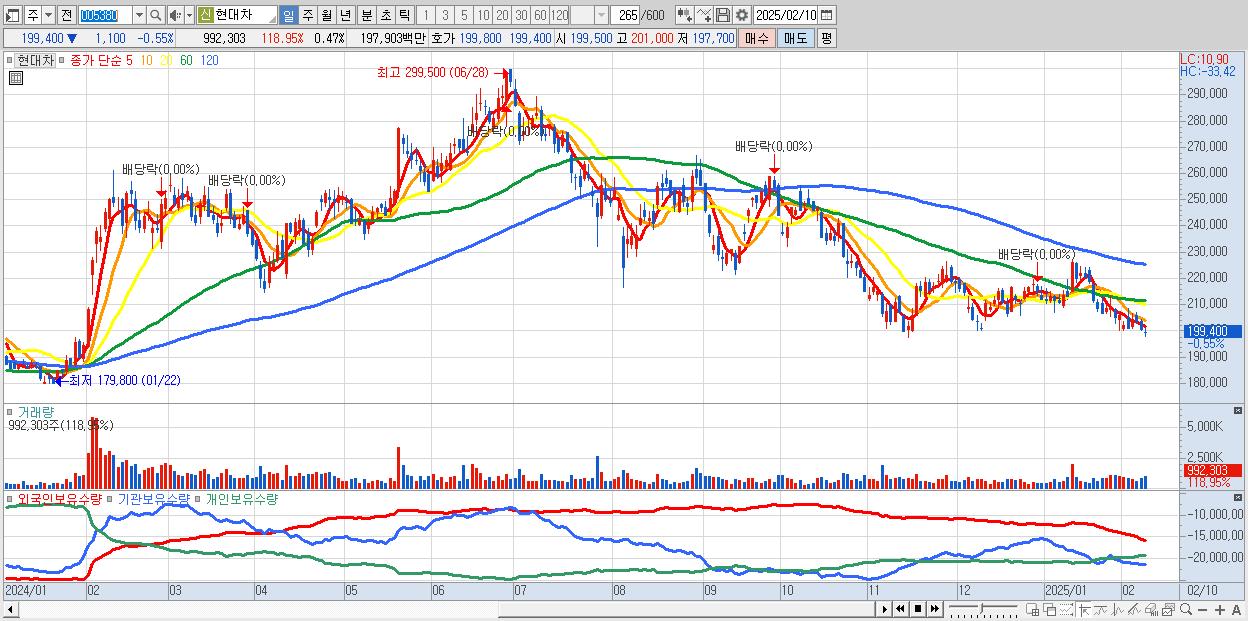 - 현대차 (199,400원 ▼ -0.55% , 시총: 417,576억, 거래량: 992,303, 거래대금:1,979억)
