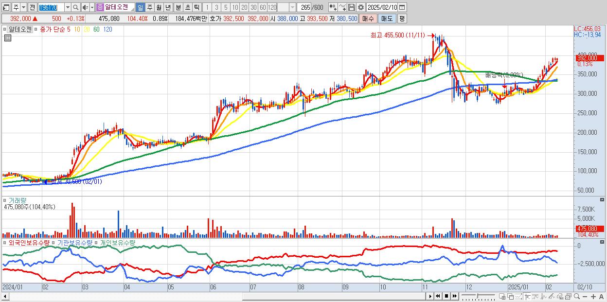 - 알테오젠 (392,000원 ▲ 0.13% , 시총: 209,010억, 거래량: 475,080, 거래대금:1,845억)