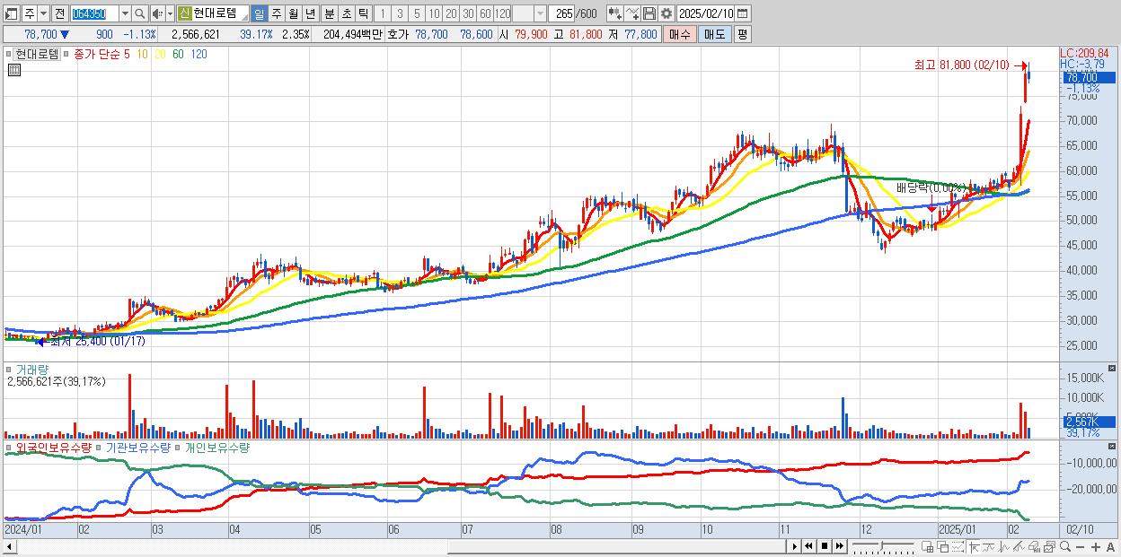 - 현대로템 (78,700원 ▼ -1.13% , 시총: 85,895억, 거래량: 2,566,621, 거래대금:2,045억)