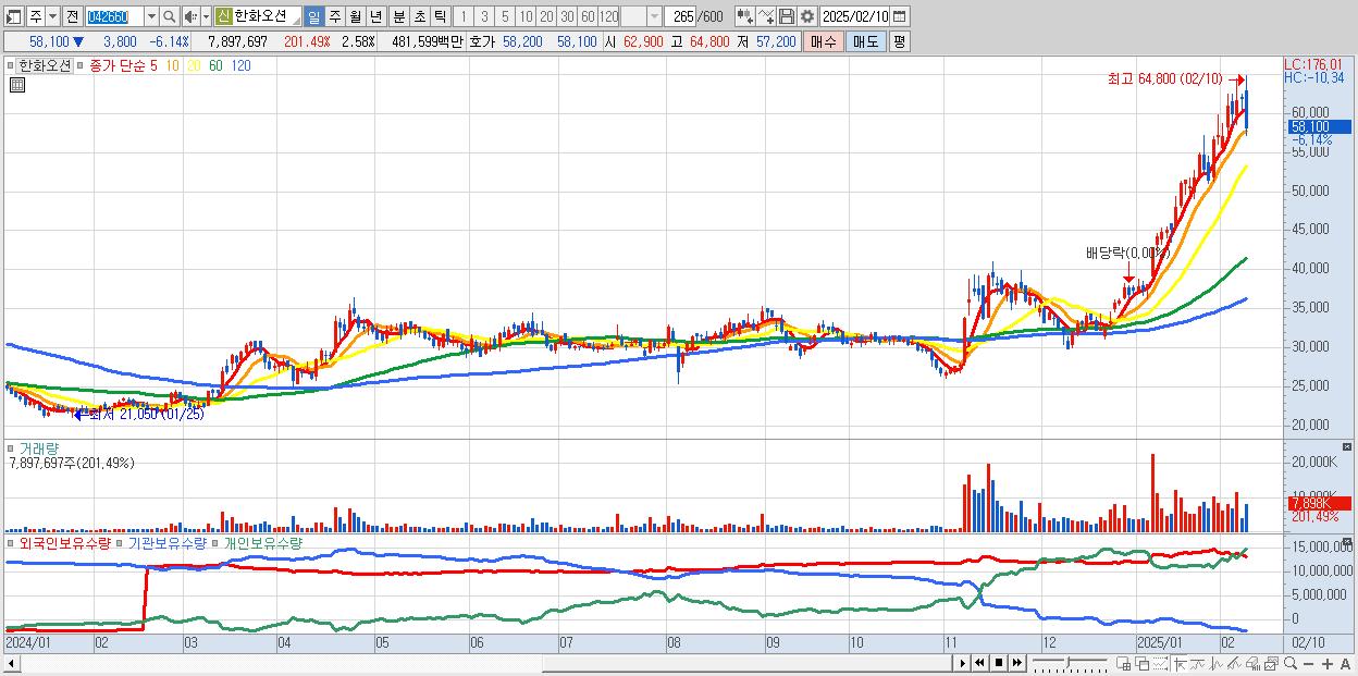- 한화오션 (58,100원 ▼ -6.14% , 시총: 178,026억, 거래량: 7,897,697, 거래대금:4,816억)