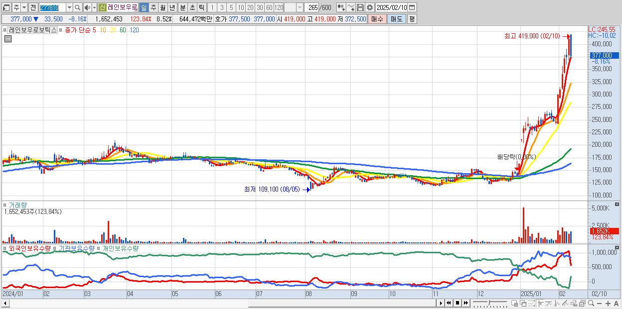 - 레인보우로보틱스 (377,000원 ▼ -8.16% , 시총: 73,137억, 거래량: 1,652,453, 거래대금:6,445억)