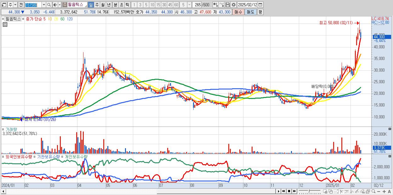 - 필옵틱스 (44,300원 ▼ -6.44% , 시총: 10,123억, 외국인 순매수 거래금:53억)