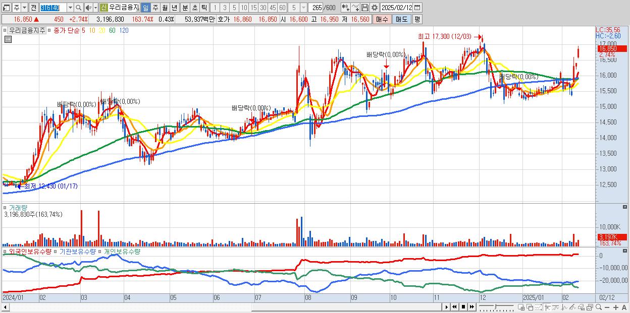 - 우리금융지주 (16,850원 ▲ 2.74% , 시총: 125,127억, 외국인 순매수 거래금:51억)
