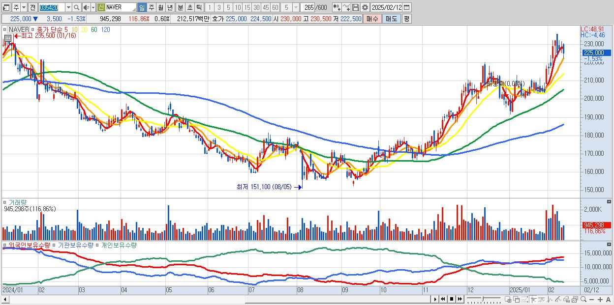 - NAVER (225,000원 ▼ -1.53% , 시총: 356,483억, 외국인 순매수 거래금:150억)