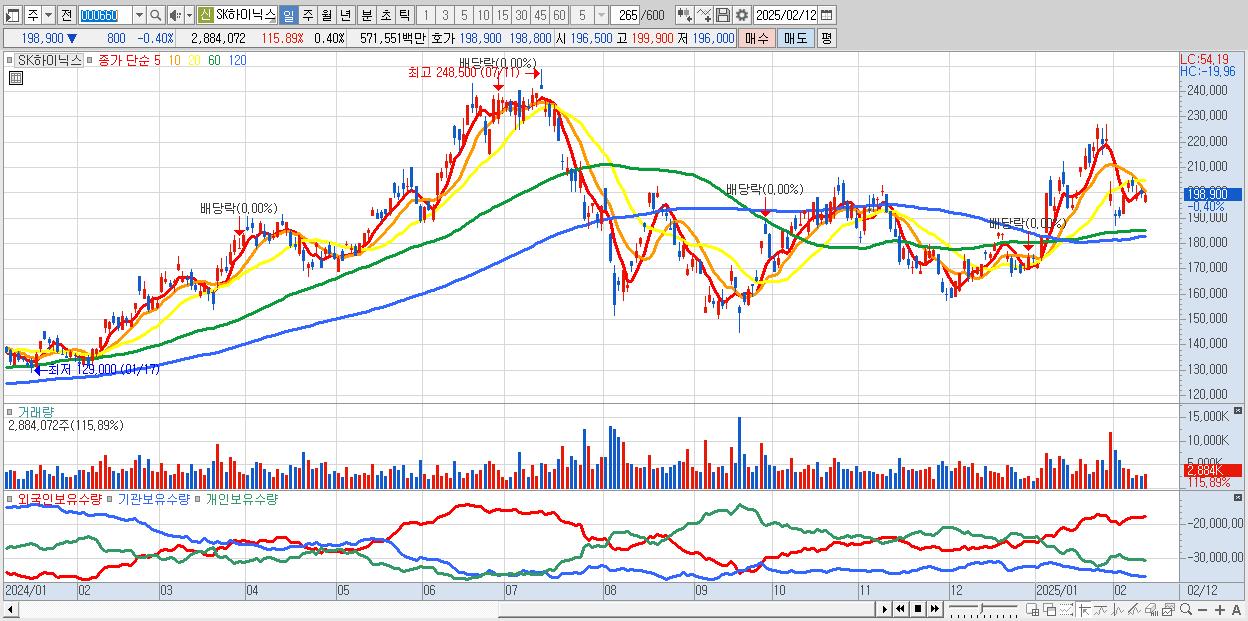 - SK하이닉스 (198,900원 ▼ -0.4% , 시총: 1,447,997억, 외국인 순매수 거래금:557억)