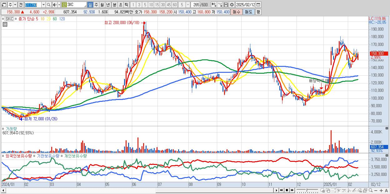 - SKC (158,300원 ▲ 2.99% , 시총: 59,946억, 외국인 순매수 거래금:55억)