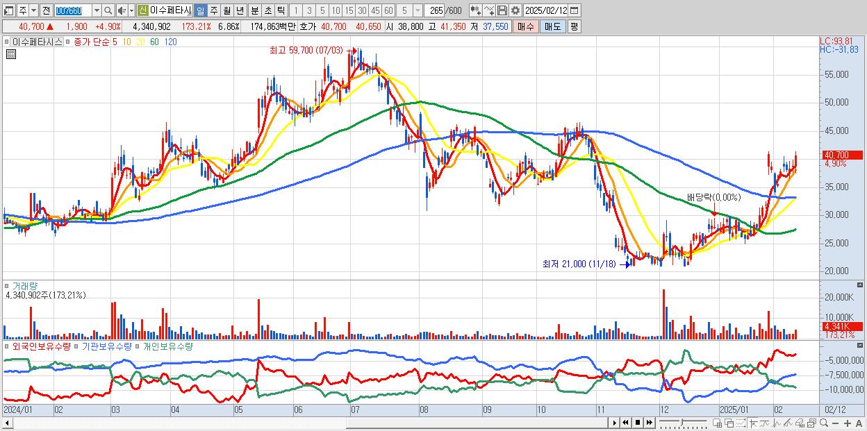 - 이수페타시스 (40,700원 ▲ 4.9% , 시총: 25,741억, 외국인 순매수 거래금:46억)