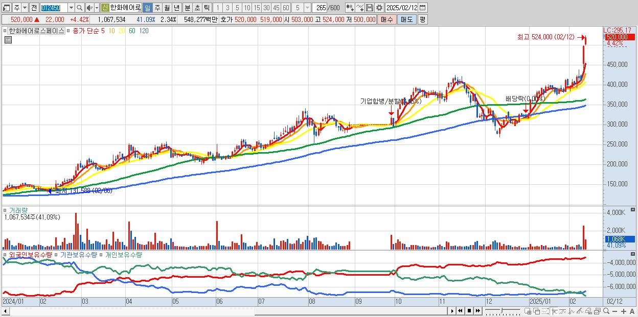 - 한화에어로스페이스 (520,000원 ▲ 4.42% , 시총: 237,022억, 외국인 순매수 거래금:239억)