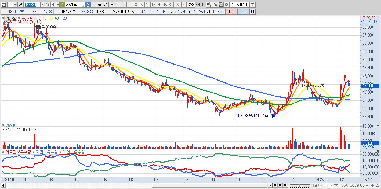 - 카카오 (42,000원 ▼ -1.98% , 시총: 186,338억, 외국인 순매수 거래금:182억)