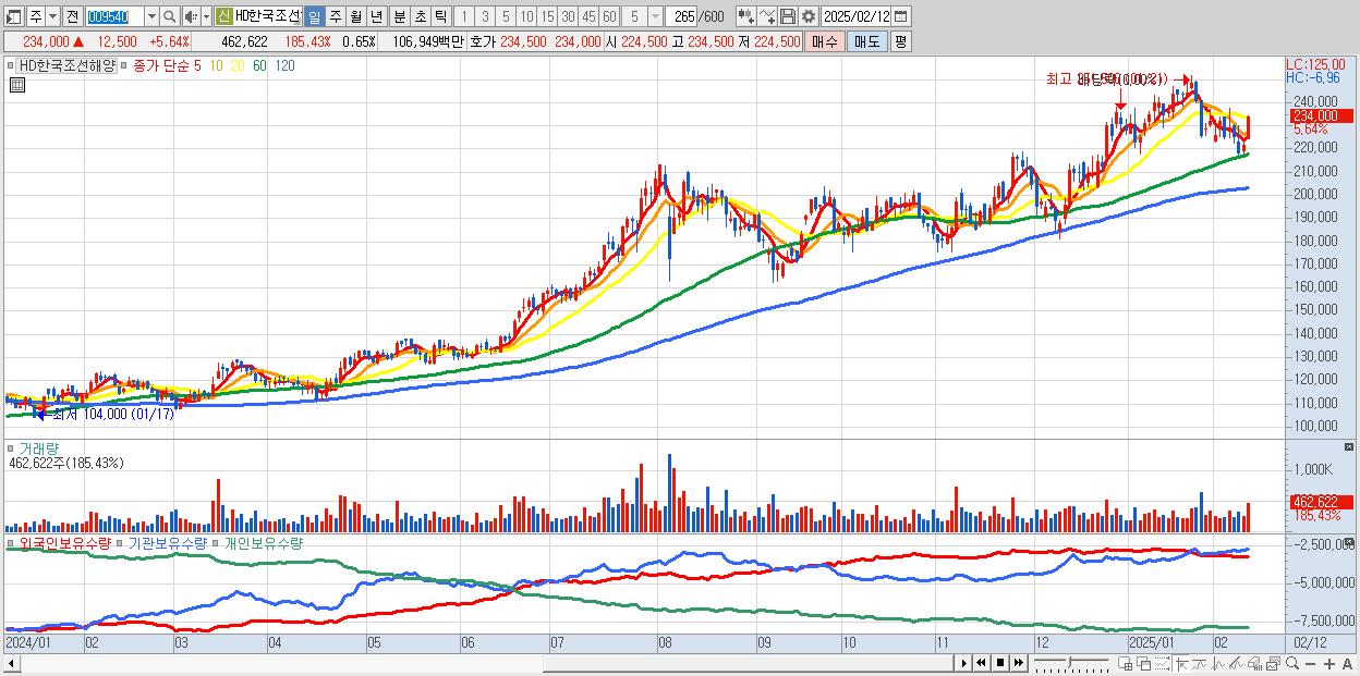 - HD한국조선해양 (234,000원 ▲ 5.64% , 시총: 165,609억, 외국인 순매수 거래금:104억)
