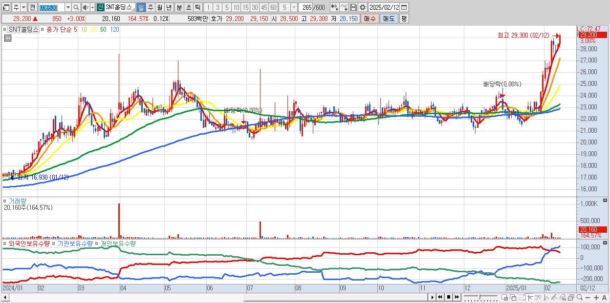 - SNT홀딩스 (29,200원 ▲ 3% , 시총: 4,761억, 거래량: 20,127, 거래대금:6억, KOSPI)