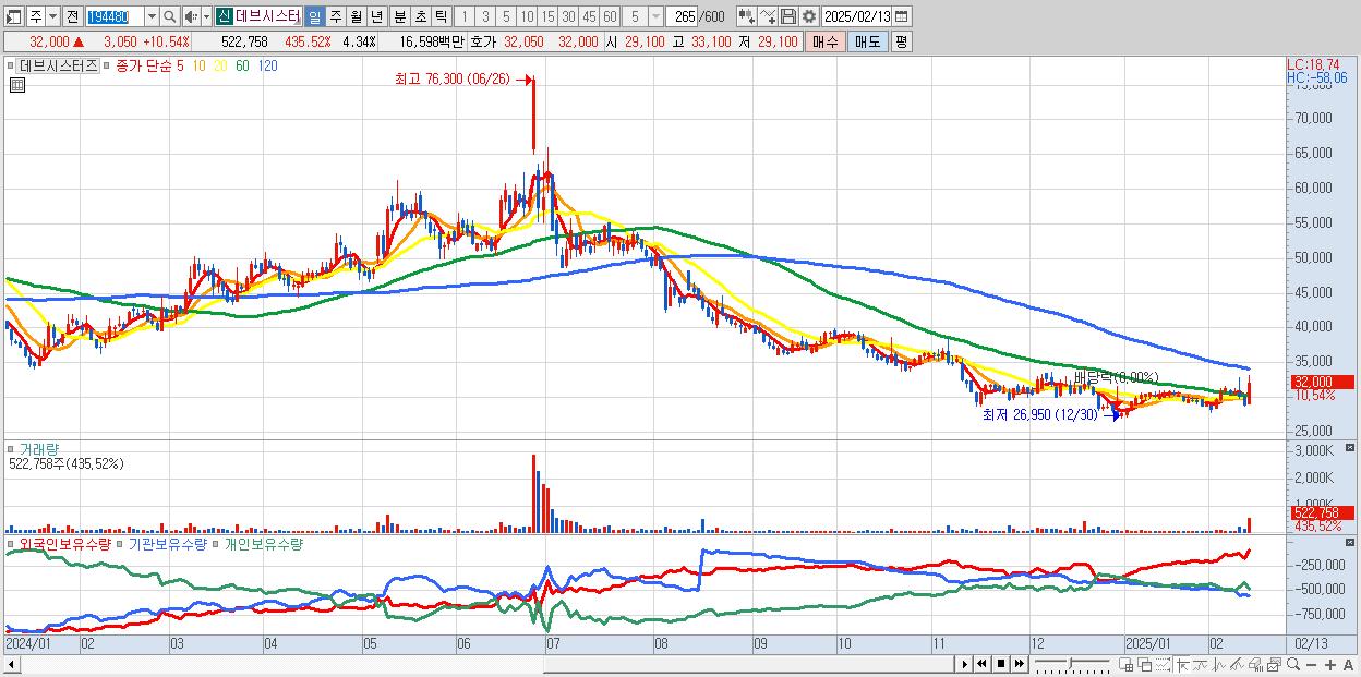- 데브시스터즈 (32,000원 ▲ 10.54% , 시총: 3,854억, 거래량: 522,758, 거래대금:166억)