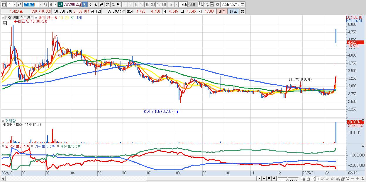 - DSC인베스트먼트 (4,420원 ▲ 18.5% , 시총: 1,215억, 거래량: 20,398,948, 거래대금:953억)
