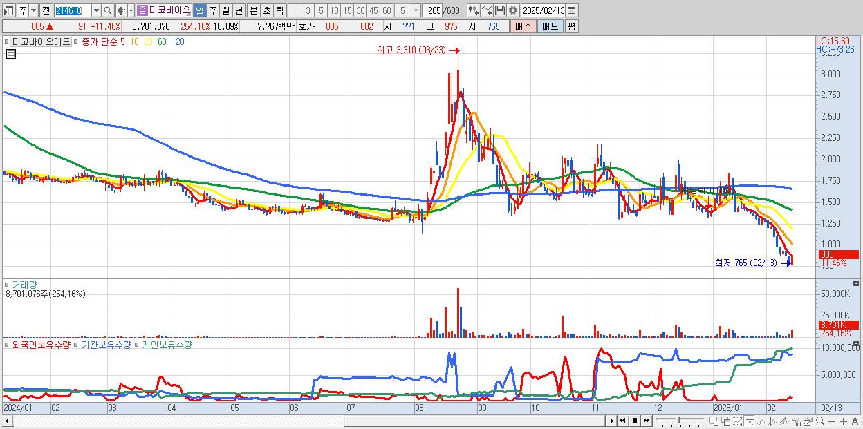 - 미코바이오메드 (885원 ▲ 11.46% , 시총: 456억, 거래량: 8,701,076, 거래대금:78억)
