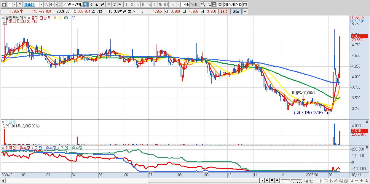 - 삼일씨엔에스 (4,955원 ▲ 29.88% , 시총: 631억, 거래량: 2,891,011, 거래대금:133억)