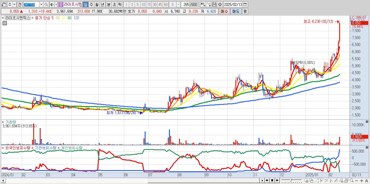 - 라이프시맨틱스 (8,050원 ▲ 19.44% , 시총: 1,774억, 거래량: 3,961,694, 거래대금:307억)