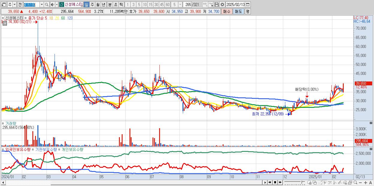 - 신성에스티 (39,650원 ▲ 12.48% , 시총: 3,584억, 거래량: 295,664, 거래대금:113억)