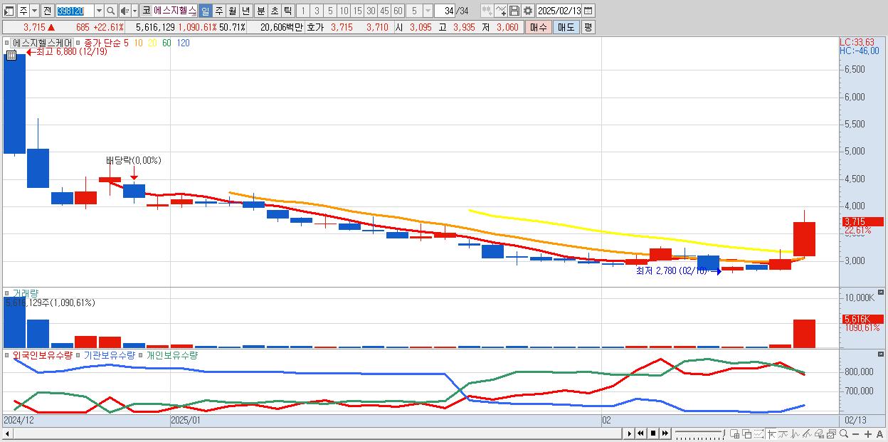 - 에스지헬스케어 (3,715원 ▲ 22.61% , 시총: 411억, 거래량: 5,616,129, 거래대금:206억)