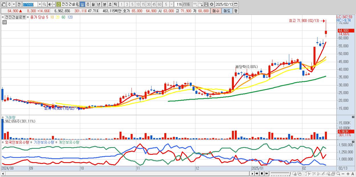 - 전진건설로봇 (64,900원 ▲ 14.66% , 시총: 9,471억, 거래량: 6,962,656, 거래대금:4,631억)